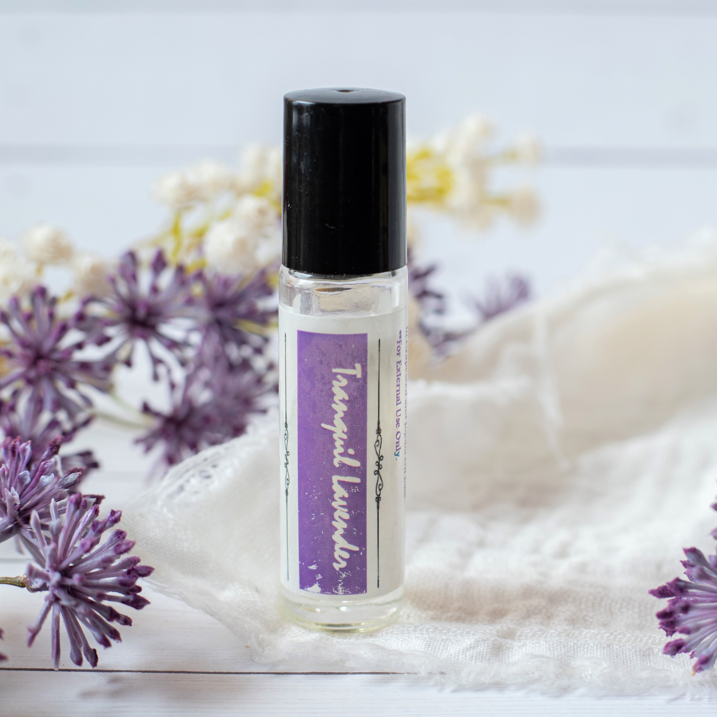 Lavender Tranquil Roll On, a natural essential oils perfume oil in a roller glass bottle. This botanical perfume benefits skin with rejuvenating jojoba oil as a base and an irresistible elegant, calming aroma. Tranquil Lavender perfume oil defused soothing aroma that is floral, refreshing, bright, and sweet.