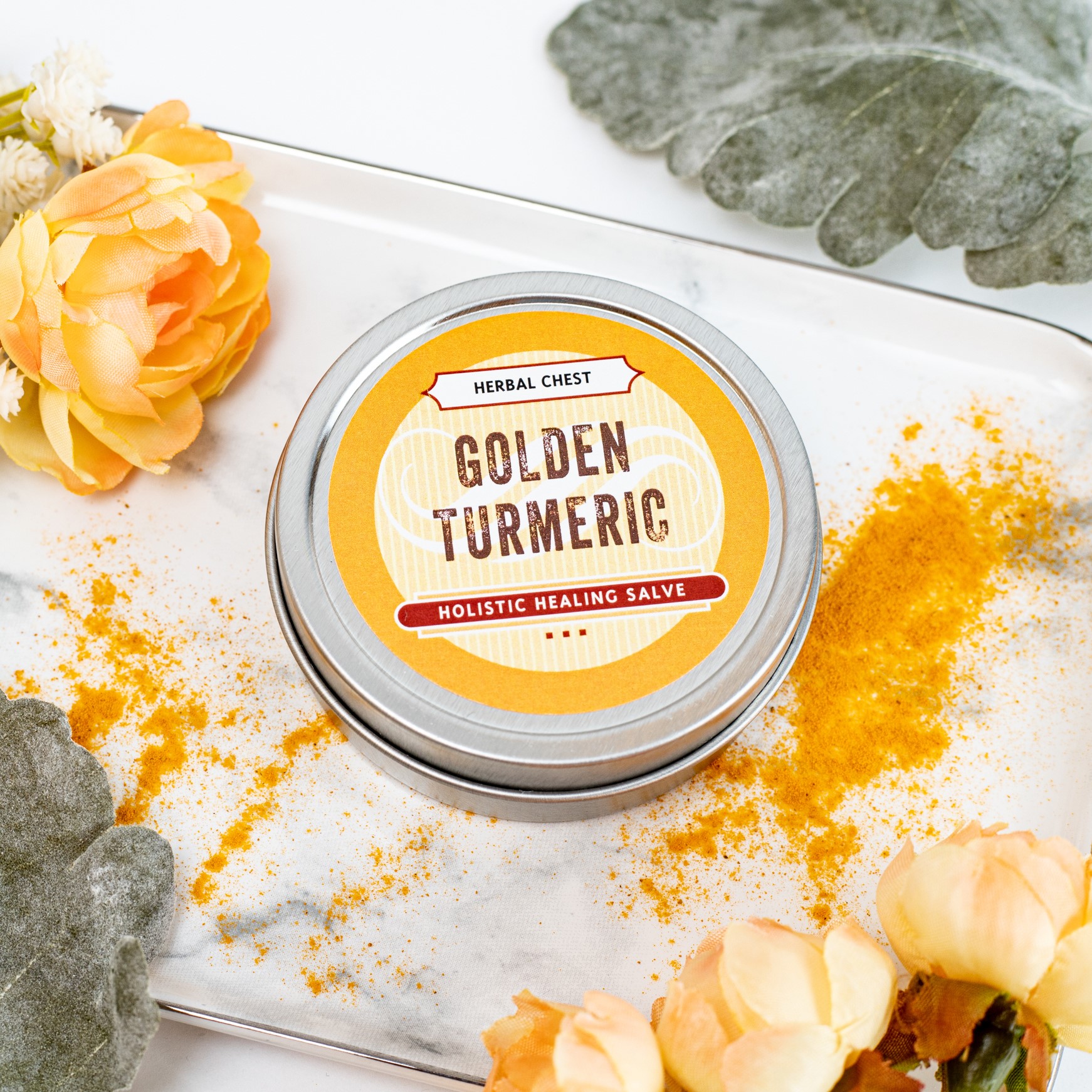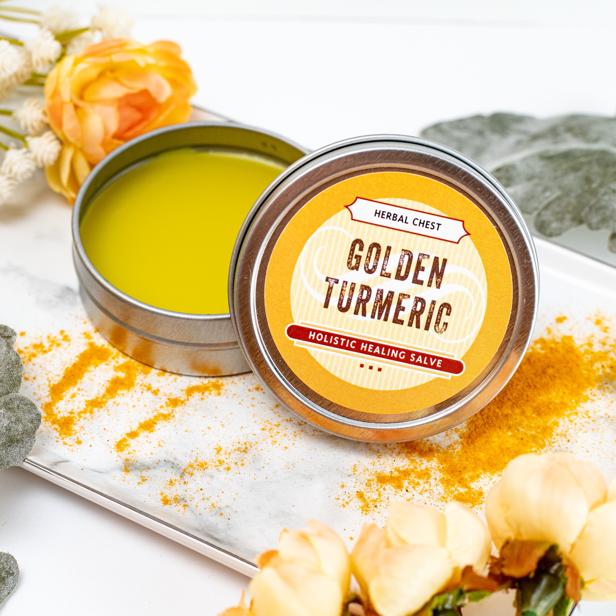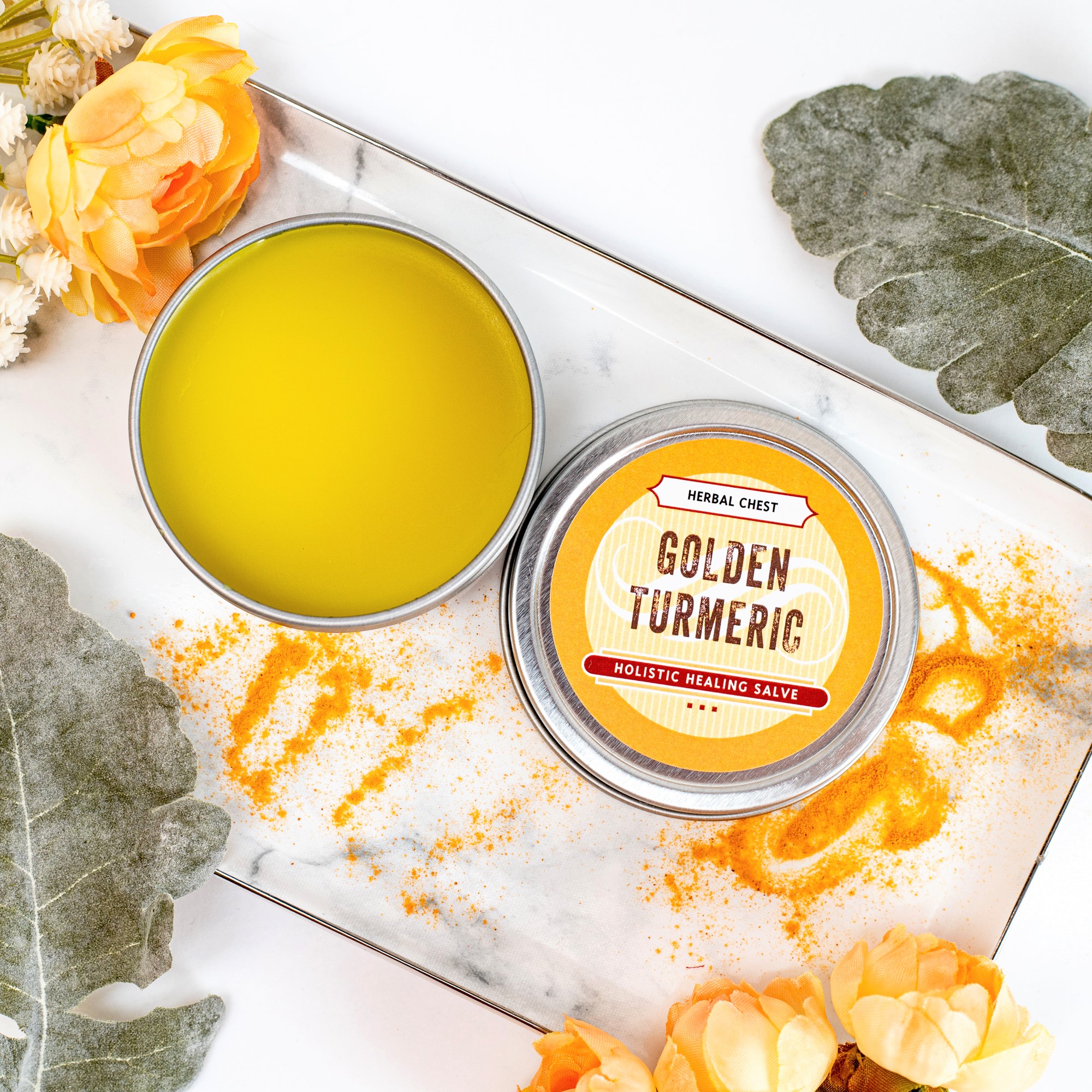 Golden Turmeric Salve, a holistic restoring salve made with featuring organic turmeric and exceptional botanical ingredients of Goldenseal Root, Peony, Calendula, Chamomile, and Yarrow.