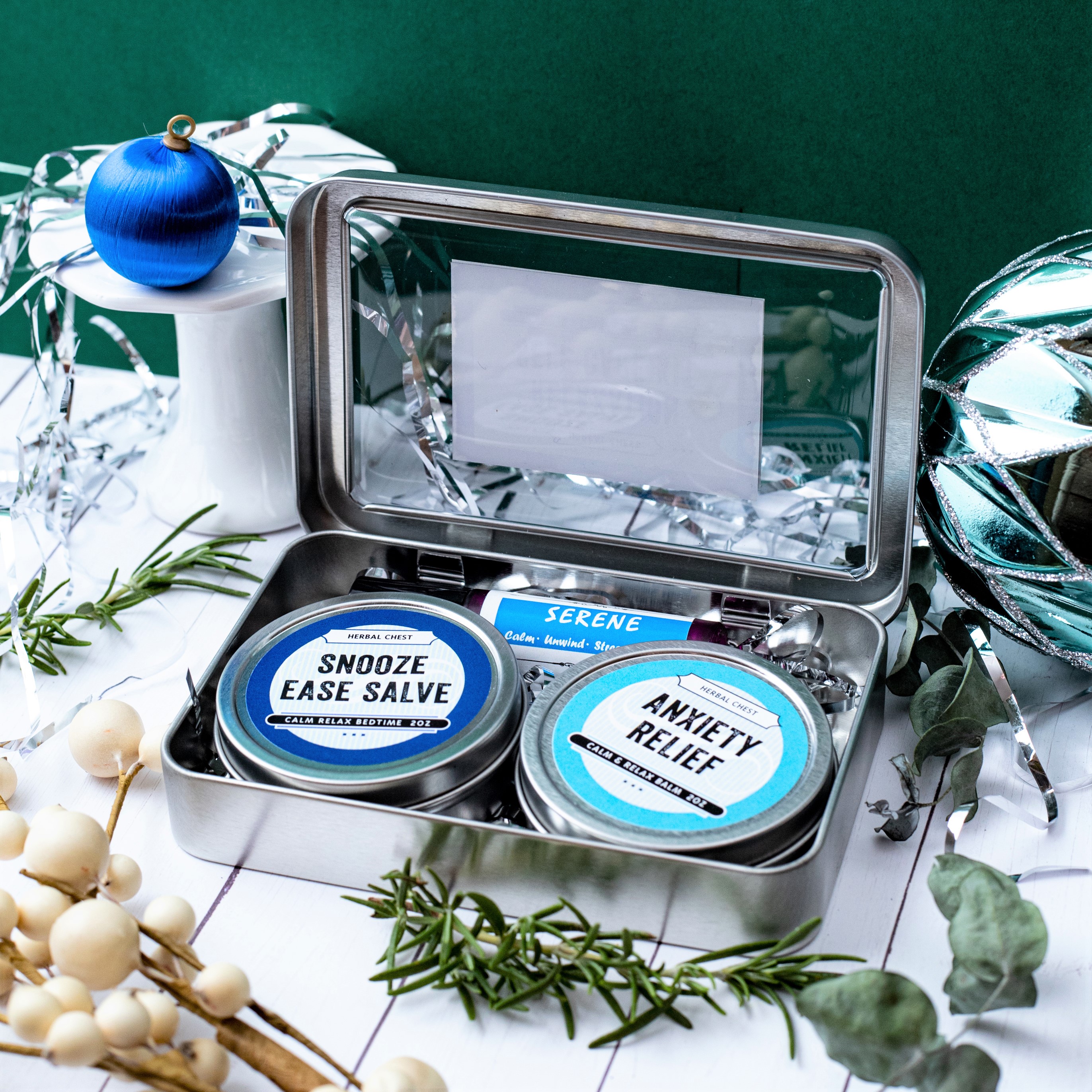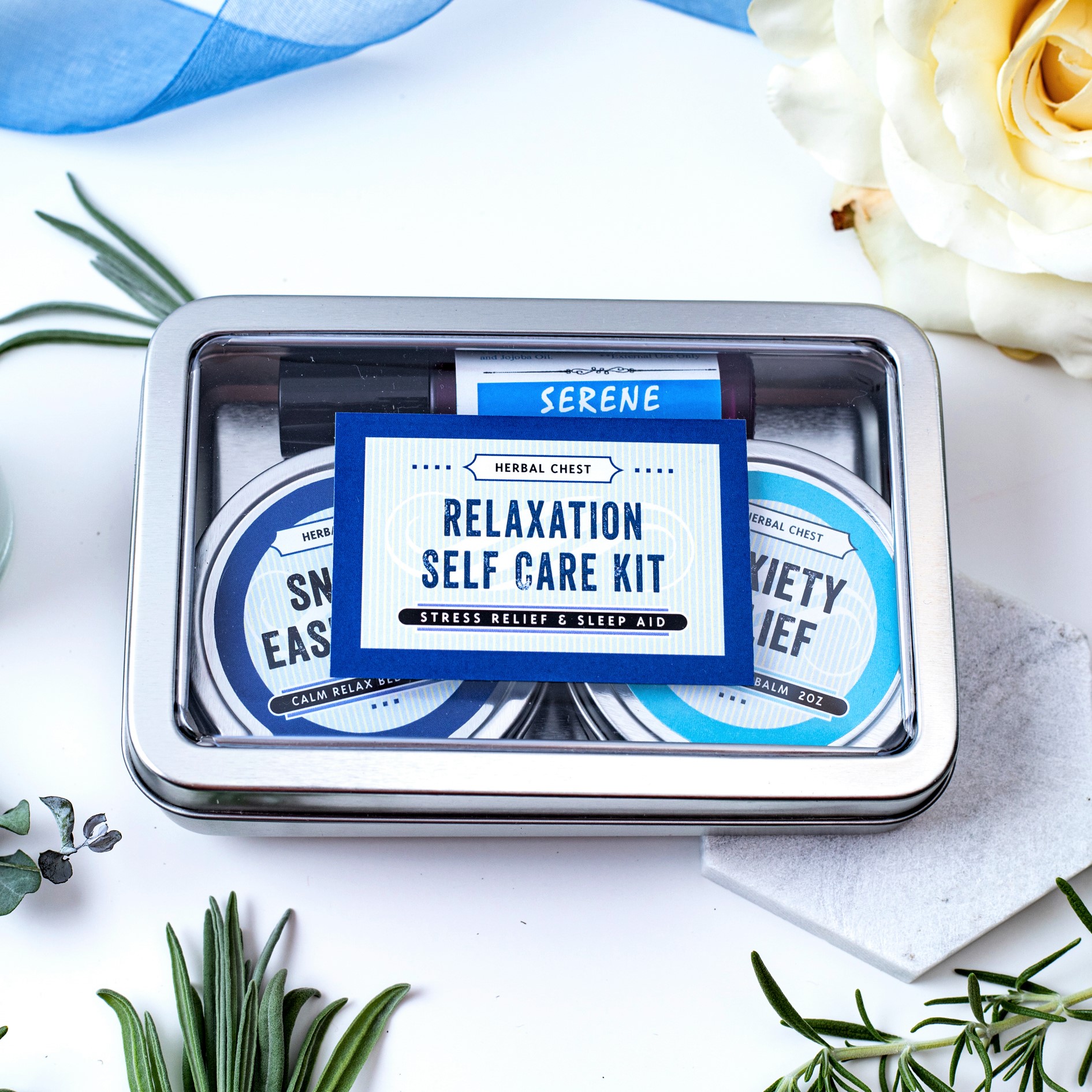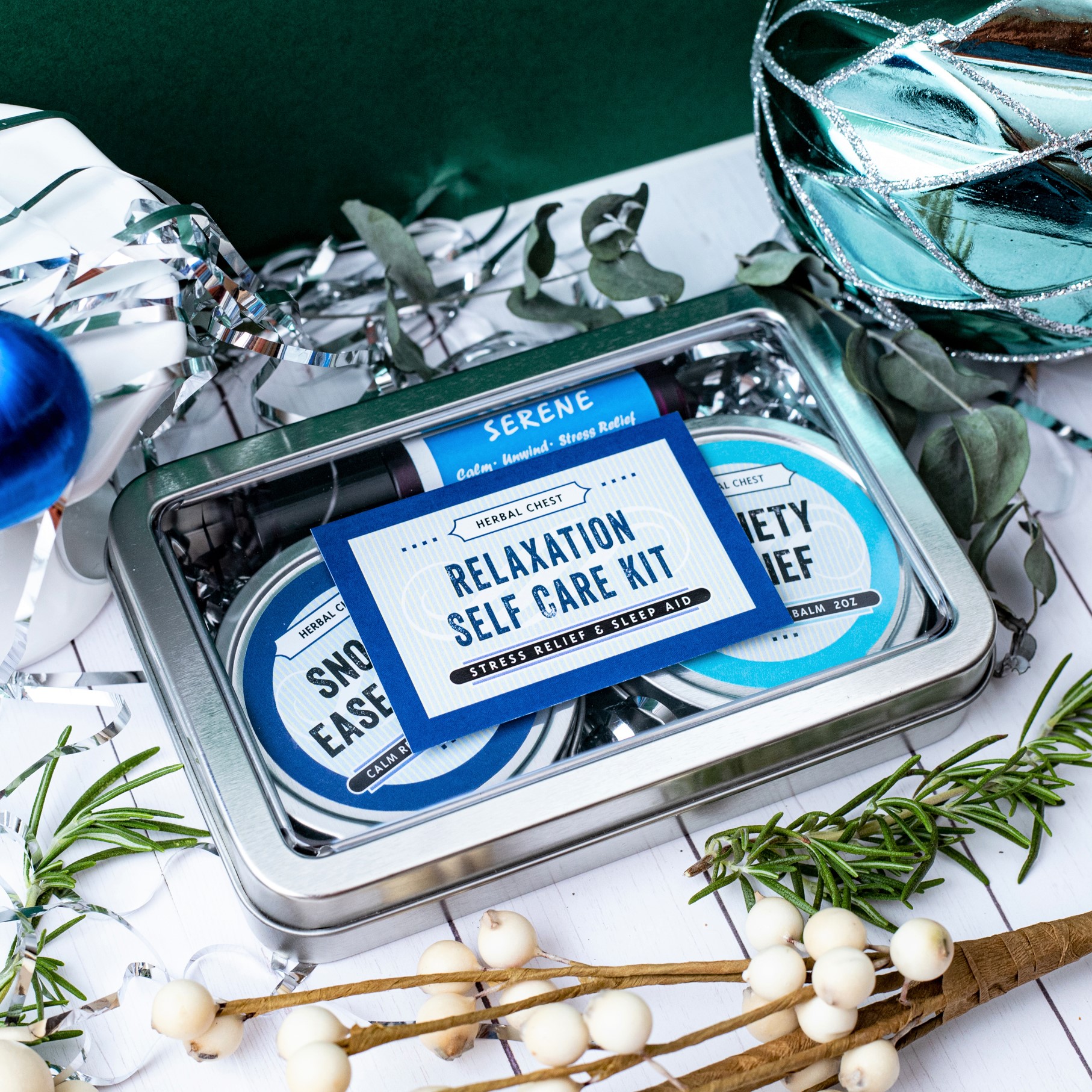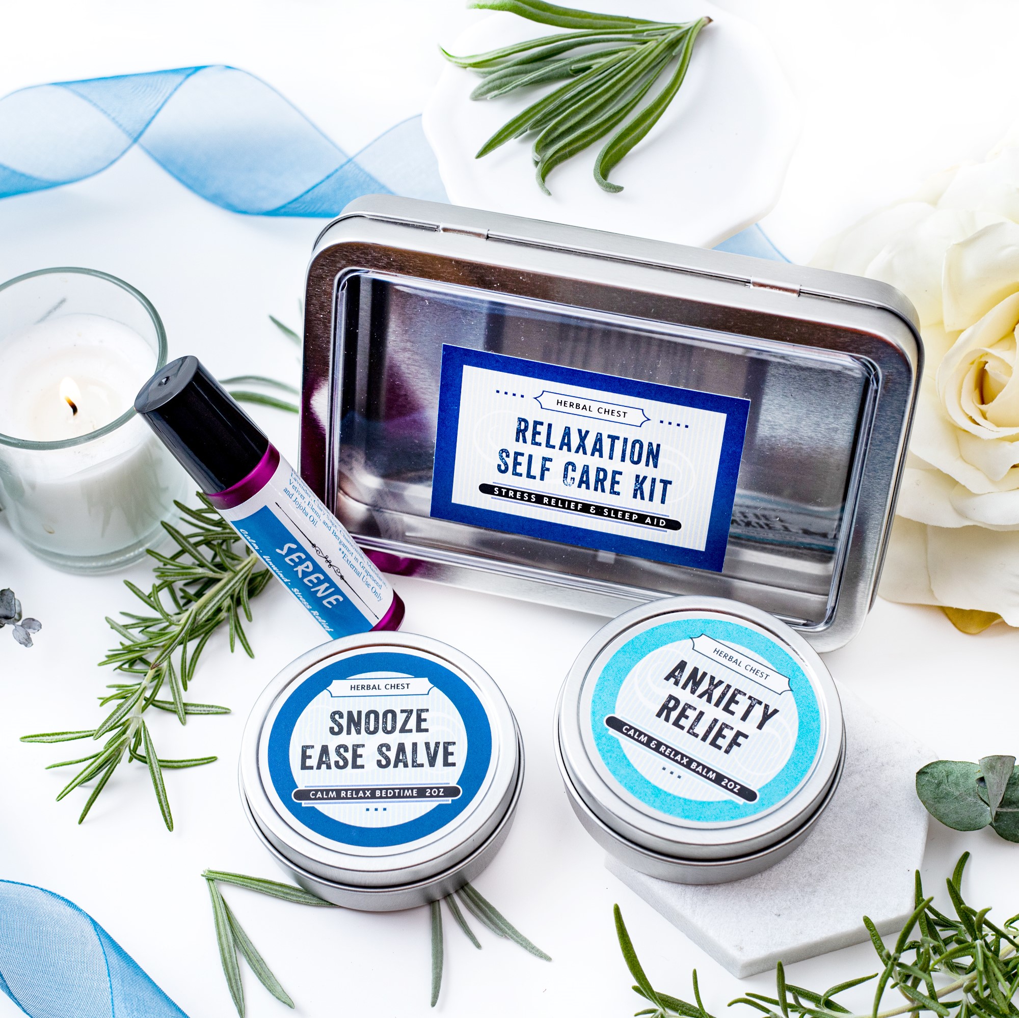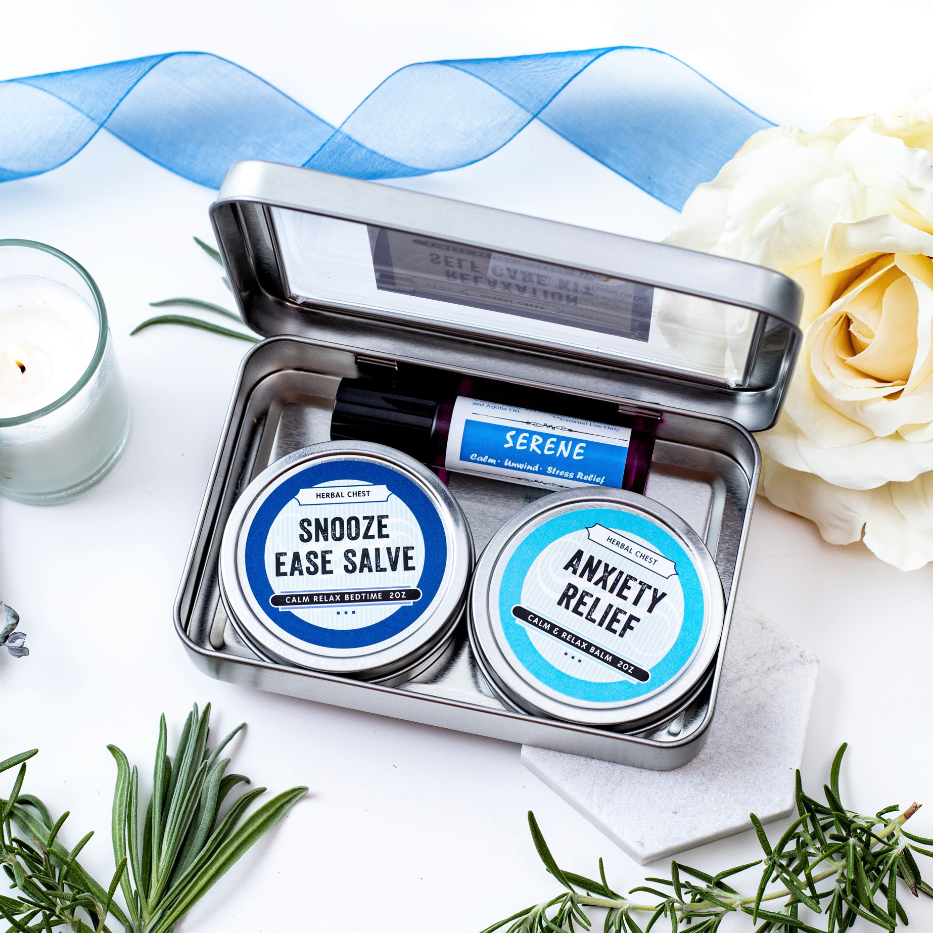 This soothing RELAXATION SELF CARE KIT is a trio of natural herbal remedies that provides stress relief, calming, anxiety relief, and bedtime aid. Self care is important. Use this kit in the event of anxiety, stress, nervousness, tension, and insomnia to have holistic well being support. Packed in a beautiful eco friendly tin.