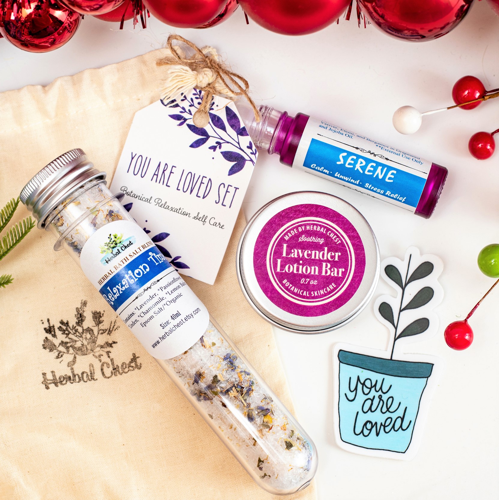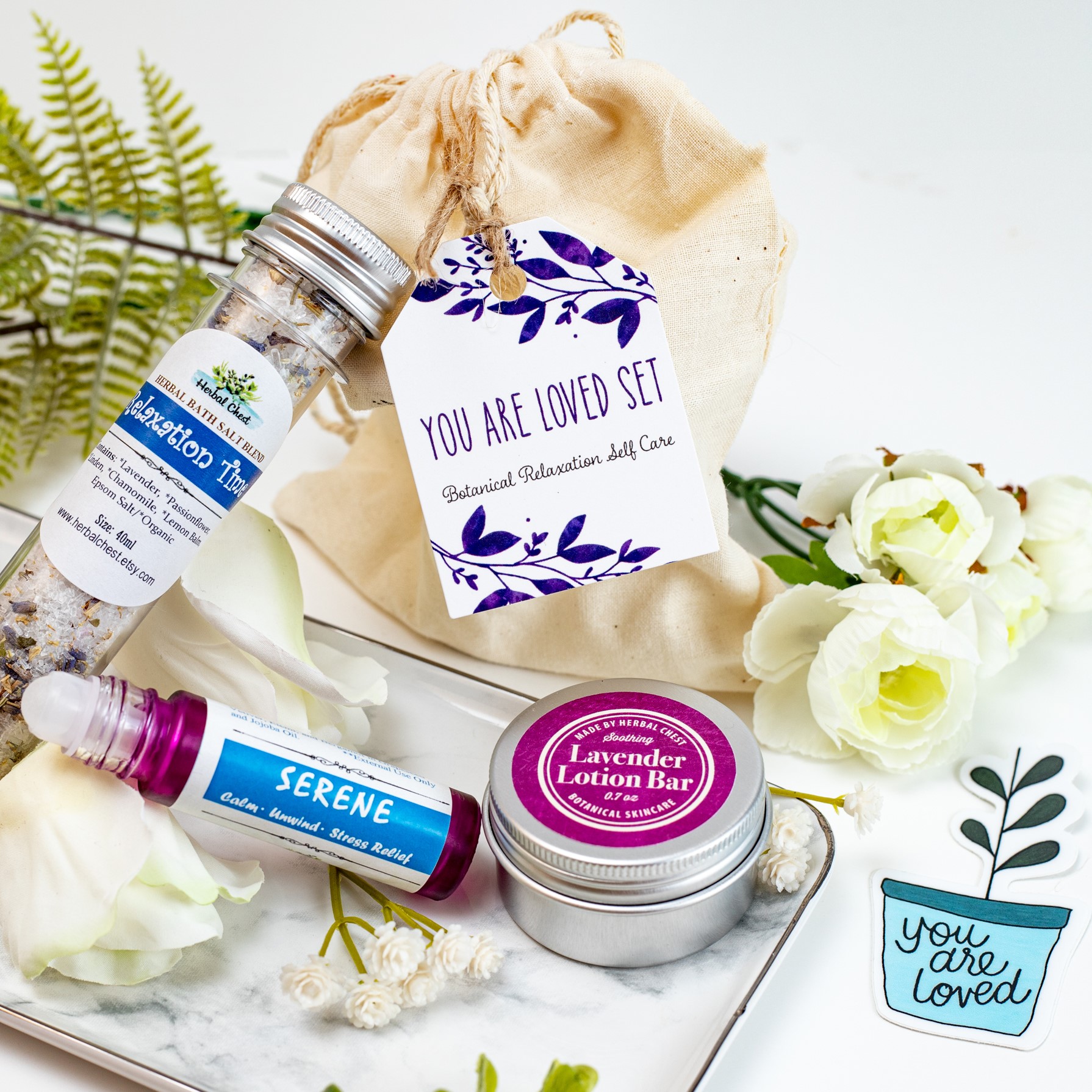 Showing a friend you care, express appreciation and love, or brighten anyone's day with this YOU ARE Loved gift set. You Are Loved set is a thoughtful encouragement gift, care package, thinking of you, cheer up, self love gift idea. This set is packed in an Eco friendly cotton drawstring bag, ready to ship.