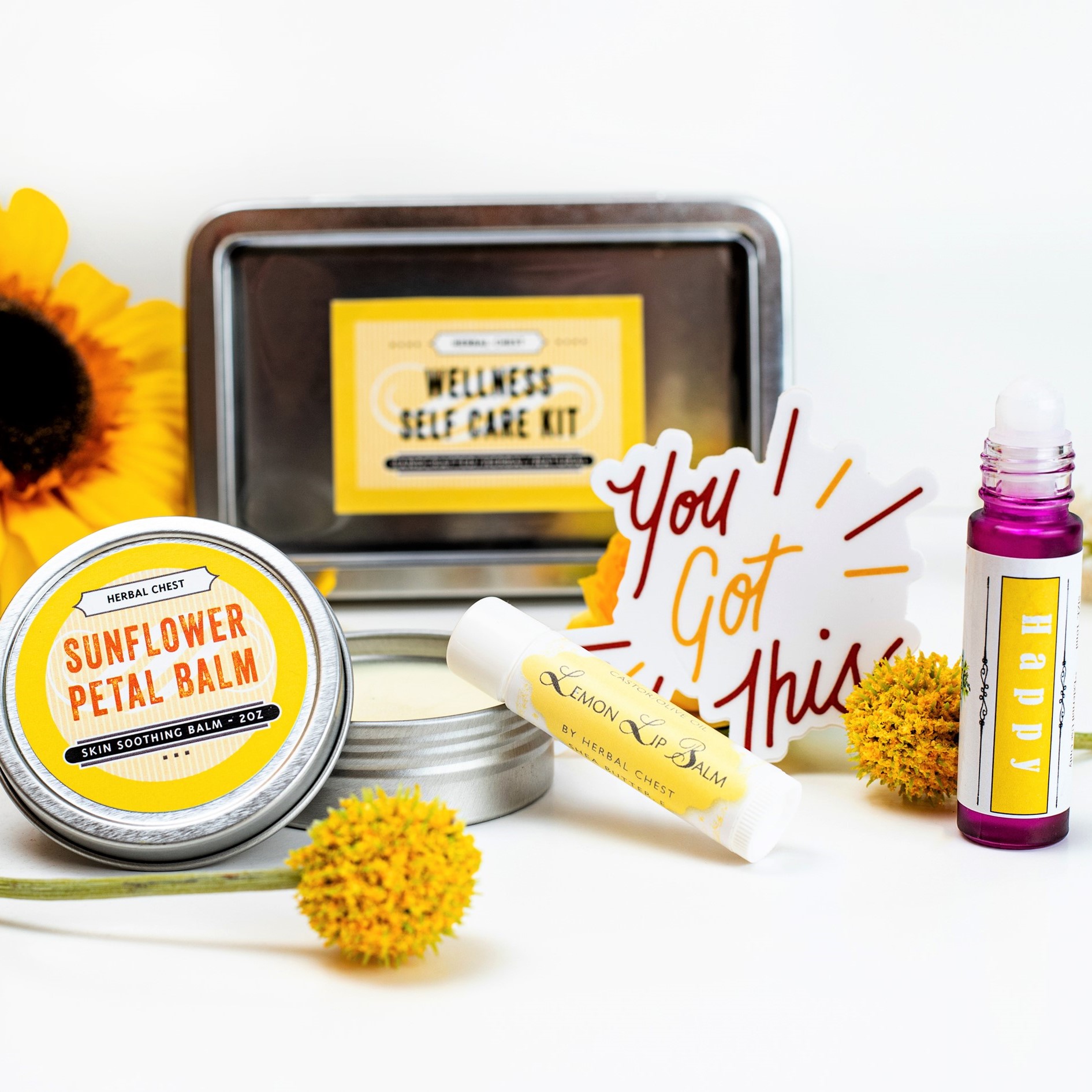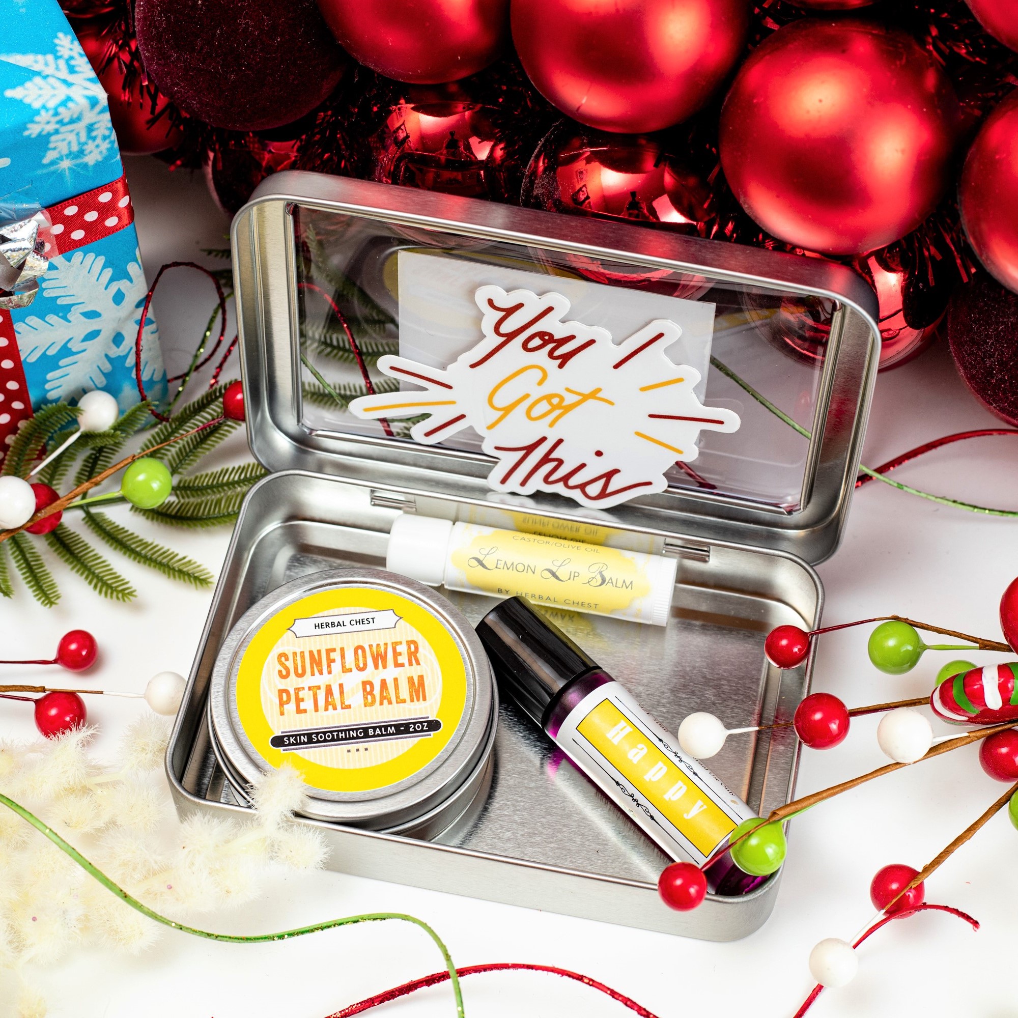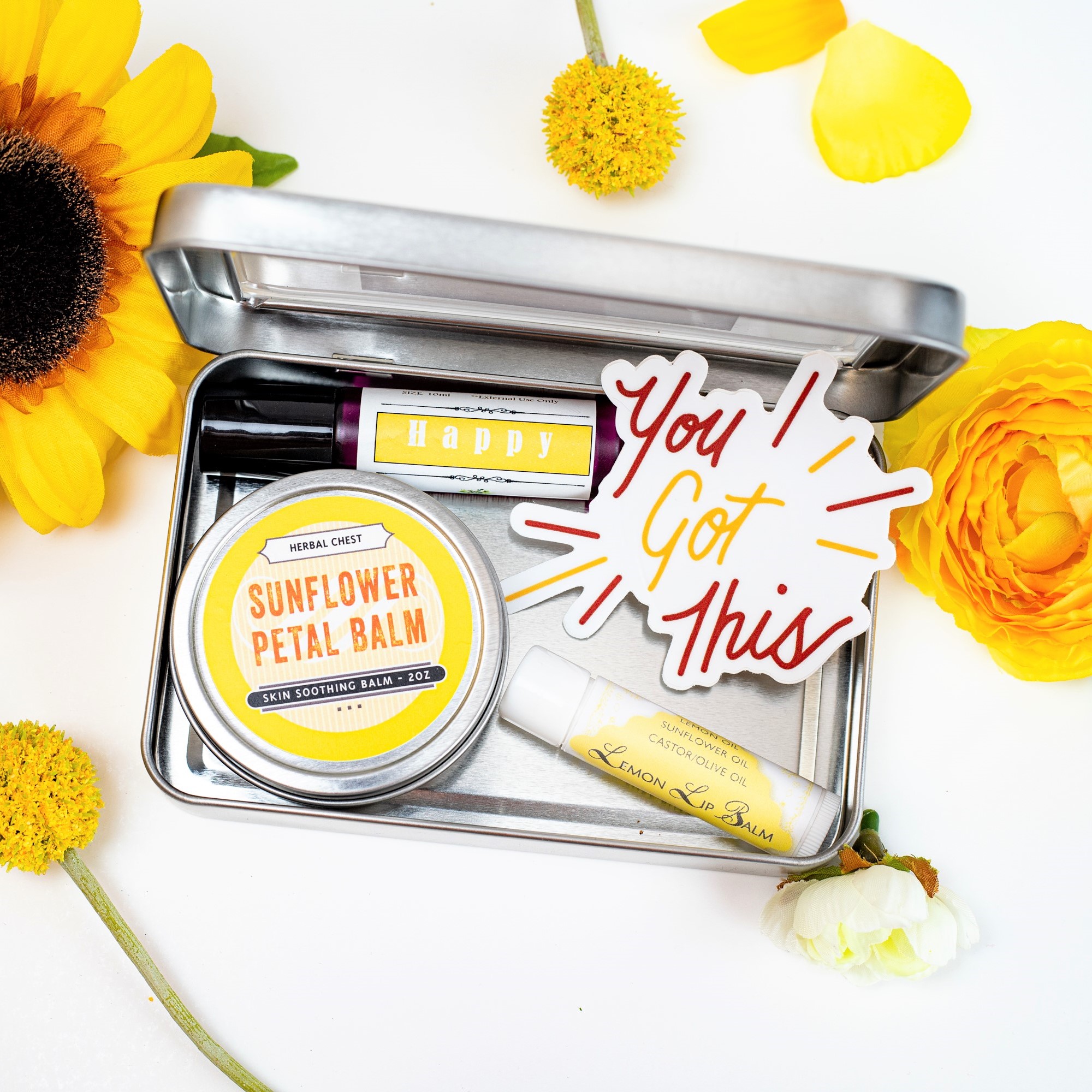 Here is a You Got This wellness self care gift set that is mindfully created to uplift, cheer up, and brighten the mood. Do you know anyone might need some sunshine, encouragement or love? Give this set to sending joyfulness, good vibes, comfort, and self-care. This set is finished in an Eco-friendly metal tin box, ready to gift.
