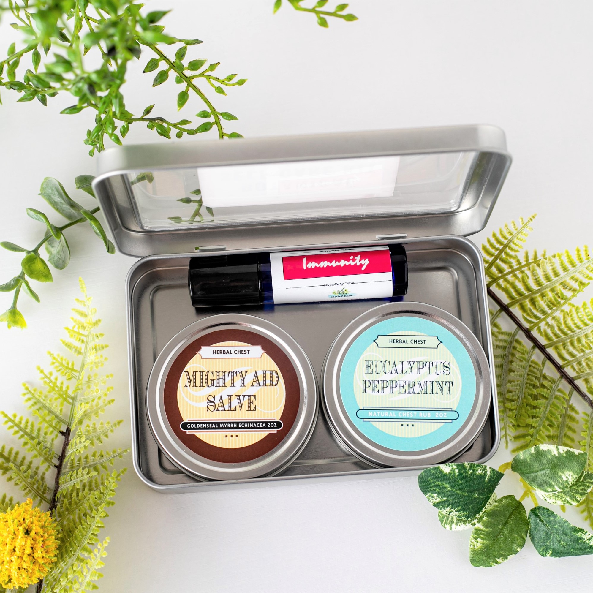 This Botanical Self Care Kit is intentionally made for everyday wellness health support. It is a collection of two herbal salves and one aromatherapy roller to form your own apothecary. This kit can be a wonderful wellness self care gift, care package, get well soon gift, or Christmas holiday gift.